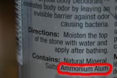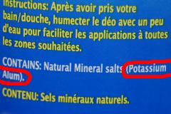 Another increasingly popular natural deodorant is the "deodorant stone": a mineral stone which is rubbed against the affected areas of the body and which has an antiperspirant effect. What would you think if you learned that these stones work just like all of the other antiperspirants, by rubbing off aluminum sulfate onto the skin? Don't be surprised, because they are based on natural aluminum-bearing minerals such as kalinite. There are many terms that marketers can use in order to carefully describe an aluminum-based product without using the word "aluminum".